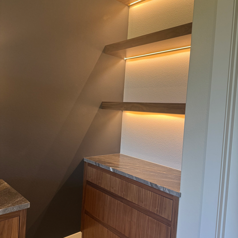 For this accent wall we've chosen a rich, moody hue to contrast with the warm wood tones and create visual interest. To balance the darkness, we incorporated of light-colored textiles, This gorgeous green bedding pulls it all together. Softening the dark accent wall and the richness of the wood. It is the perfect place to lay your head.