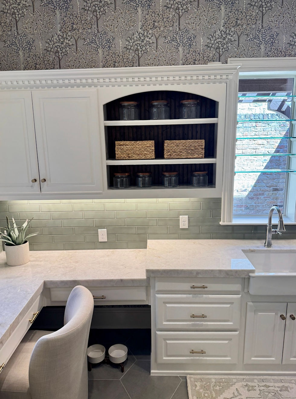 Storage was a key priority. Upper cabinets and vertical storage maximize every inch, keeping detergents, cleaning supplies, office items, and daily clutter neatly tucked away. Open shelving adds a moment of contrast and accessibility, while still feeling styled and intentional. By designing upward instead of outward, the countertops remain clear and functional, making the room easier to use and easier to maintain.