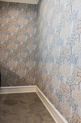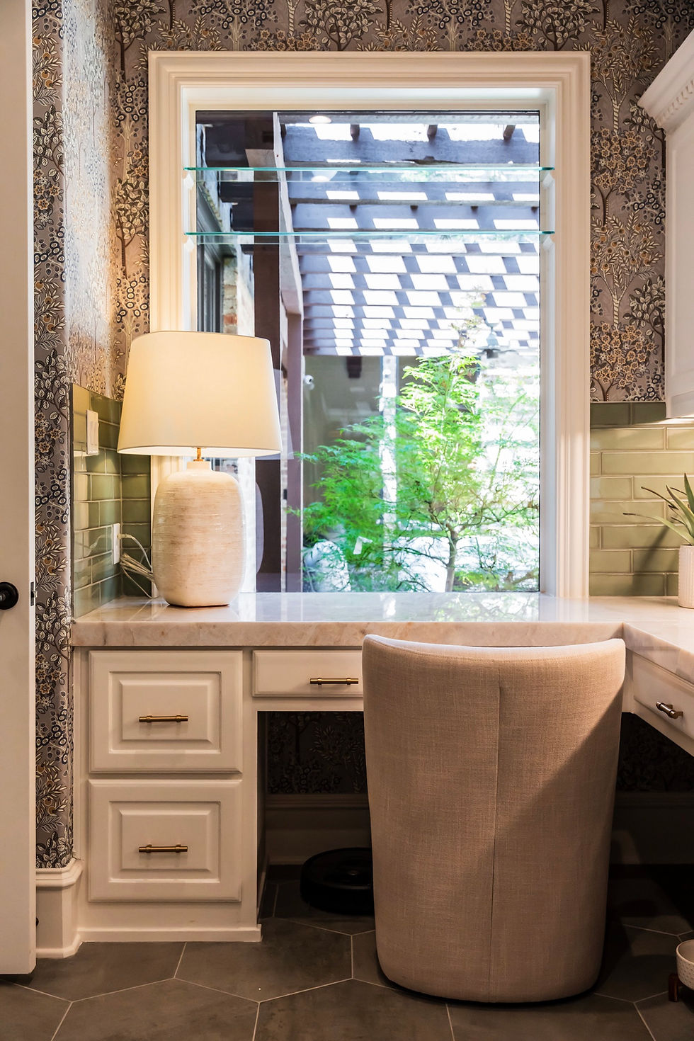 In this space, wallpaper plays a starring role. Rather than reserving pattern for formal rooms, we used it to bring personality and warmth to an everyday work zone. The subtle, layered motif adds visual interest and depth, transforming the room from basic to elevated while still feeling calm and timeless.
