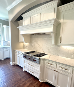 Stone countertops and backsplash paired subtle metal finishes weave together a palette that feels grounded and warm. Ample space and cabinetry keeps the space feeling calm and uncluttered.