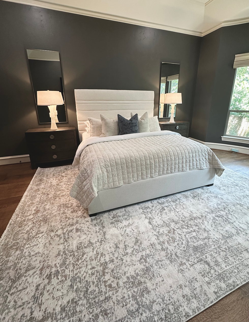 Charcoal gray walls add instant depth. Instead of making the room feel smaller, the dark paint creates a dramatic canvas that allows lighter furniture and bedding to stand out. Pairing deep wall colors with neutral furnishings is a great way to achieve contrast while keeping the mood serene. The pair of mirrors, lamps and nightstands add an element of symmetry to the space. In addition, the mirrors give the illusion that the room is more spacious. A large area rug in a subtle pattern adds interest without distracting from the clean lines of the furniture. It also softens the hardwood floors.